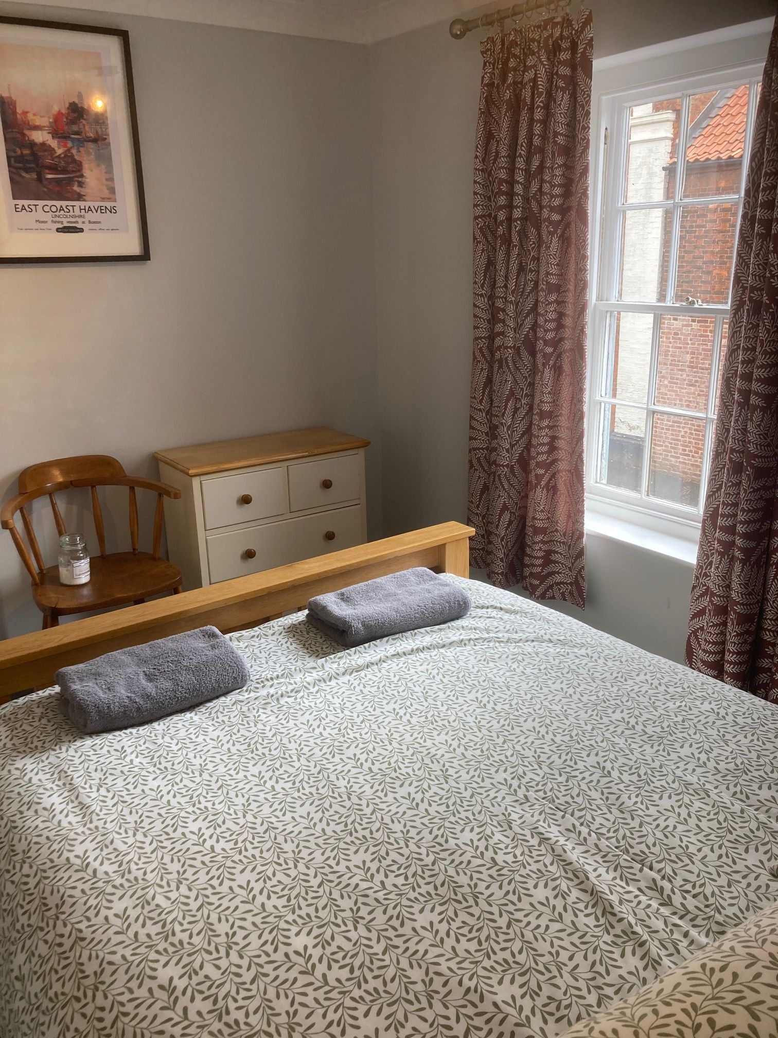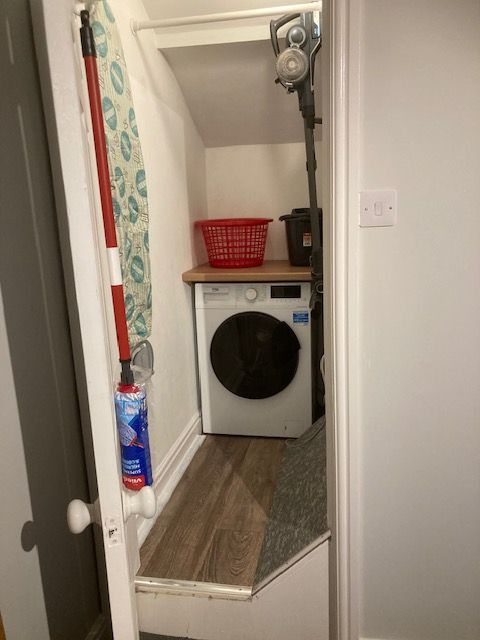 Opposite is the bedroom. The Oak double bed has a bedside table to the left with a bedside lamp. A chest of drawers is available for clothing etc complete with a hairdryer. The walk in cupboard houses a washer dryer( with detergent and conditioner), Cordless vacuum cleaner, ironing board, iron and plenty of hanging space.