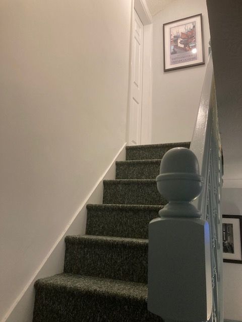 The stairs ascend in the room to the upstairs landing. Turn left into the bathroom
