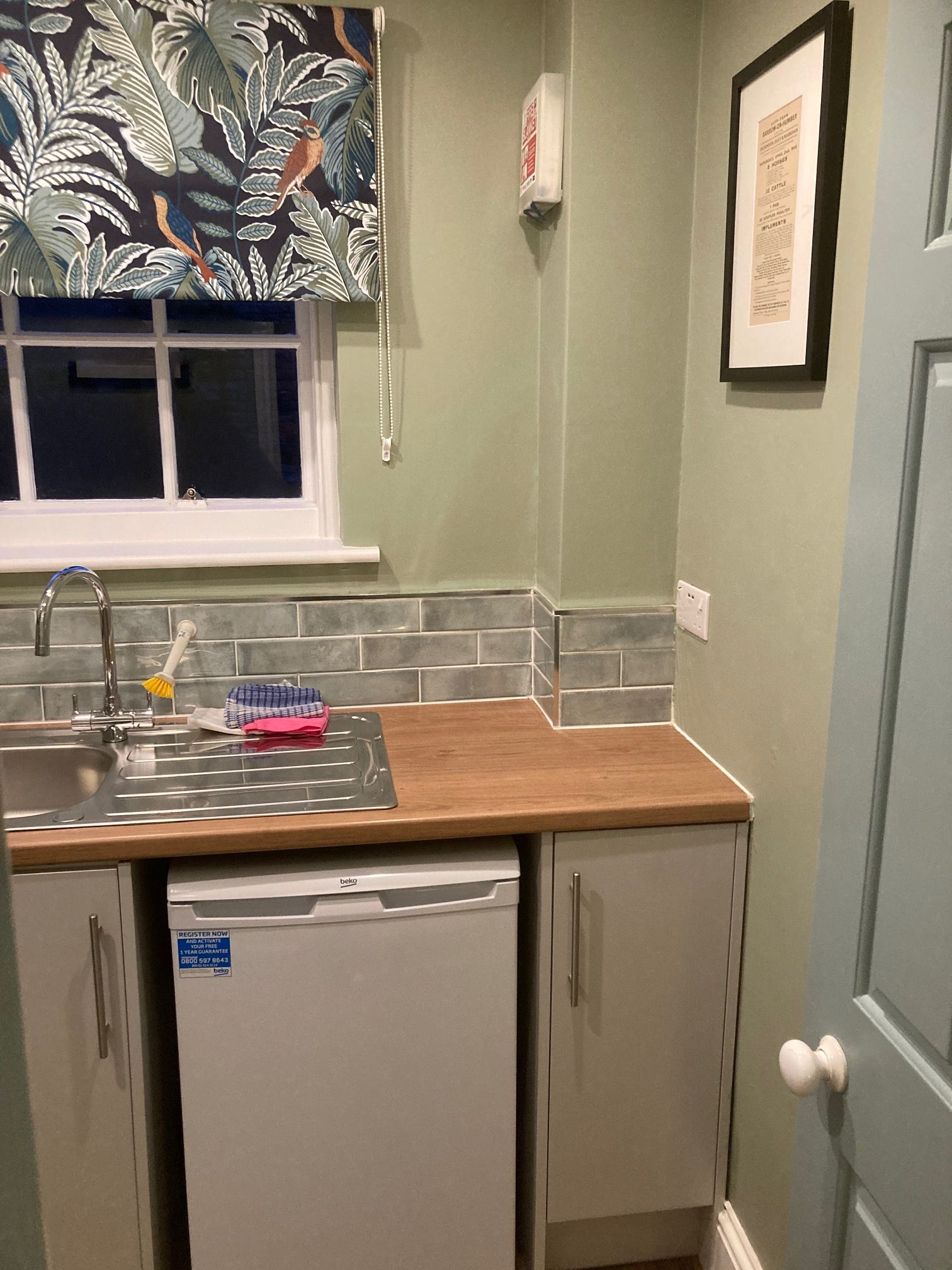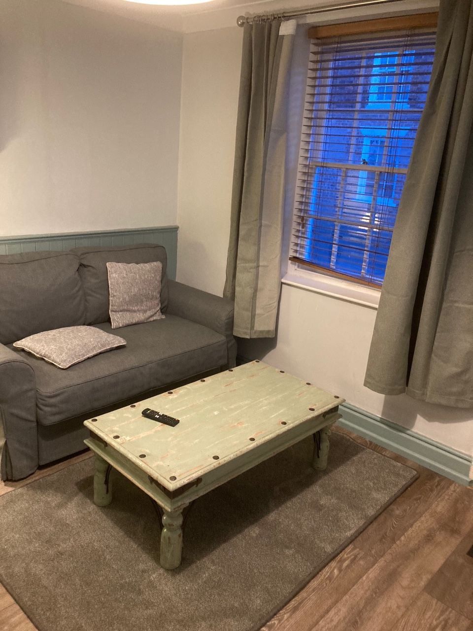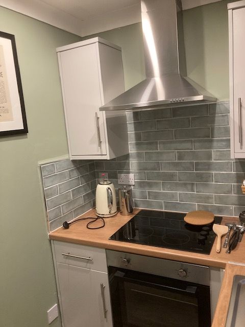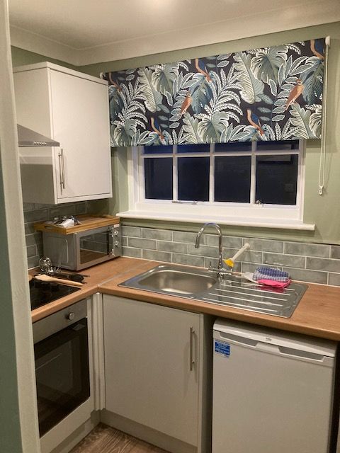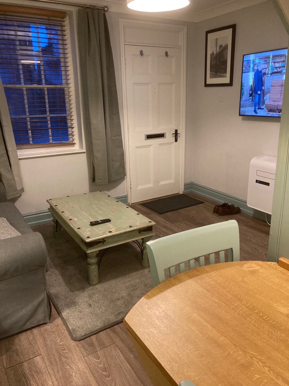 The comfortable lounge area has a sofa, coffee table and wall mounted smart TV. The room also houses a dining table tucked under the stairs This dining area with fold out extending leaf also forms a work area with good access to plug sockets. It is well lit and the internet is fibre and high speed.