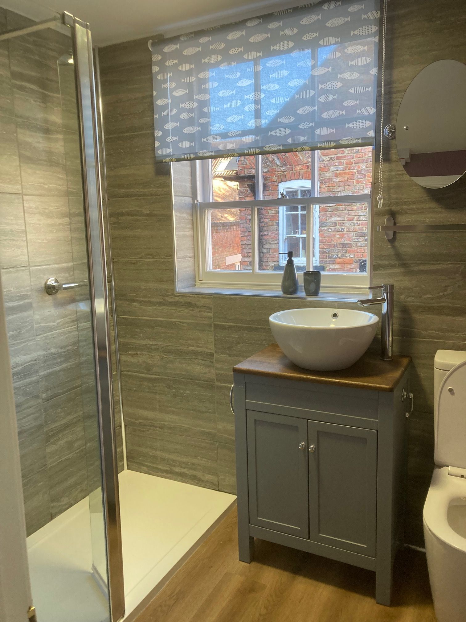 The large walk in shower has a glass screen. There is a Bristan electric shower to provide good pressure and a good flow of water for a refreshing drench. The wash basin stands on its base unit The toilet is tucked alongside. the heated towel rail keeps your towel fresh and dry. A wall mounted fan heater enables the room to be warm whatever the weather and an extractor ensures condensation is removed